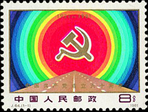 中国共产党第一次全国代表大会于1921年7月23日至31日在上海和浙江嘉兴召开,出席大会的有各地共产主义小组选举推派的代表共13人,代表党员57人。大会通过了中国共产党的第一个党章。该套邮票由刘硕仁设计,于1981年7月1日发行。