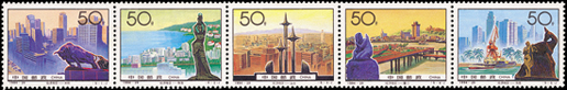 深圳位于我国南部地区,拥有海洋的地理优势,深圳是中国改革开放后设立的第一个经济特区,经过20年的努力,昔日的边陲小镇现已发展成为一个经济繁荣,社会全面进步的现代化国际大都市。邮票中可以看出现代化的高楼大厦,活动中心等建筑物,整个城市现代感十足,被誉为中国改革开放的窗口。该套邮票由于万新、张雪峰设计,于2000年8月26日发行。