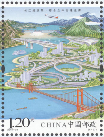 2018年8月26日,中国邮政发行《长江经济带》特种邮票1套6枚,小全张1枚。邮票图案名称分别为:共抓大保护、综合立体交通走廊、产业转型升级、新型城镇化、开放新格局、区域协调发展。邮票以手绘方式生动展示了长江经济带全方位的发展成就。第一图描绘了长江经济带共抓大保护的发展理念和美丽的自然生态。第二图展现了长江经济带科学高效的综合立体交通走廊。第三图展示了长江经济带产业转型升级,加速培育新动能。第四图描绘了长江经济带以人为本的新型城镇化。第五图展现了长江经济带的开放新格局。第六图描绘了长江经济带的区域协调发展。邮票设计者为邹庆。