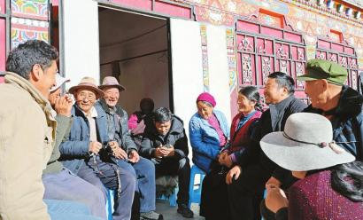 1月26日,在其美多吉邻居拉姆措家院坝里,十几位村民和干部正热议其美多吉受表彰的事。