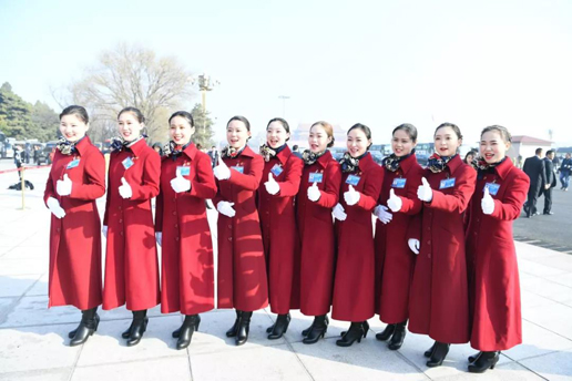 她们今天每个人都不约而同地选择了红色上衣,和人民大会堂、天安门广场上的红旗相互映衬,红色是今天的主题,这红是不断涌动的红,这红是希望的红。