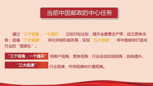 中国邮政当前的主要矛盾是什么?党课提出,是能力与充分竞争中生存发展的矛盾。除了普遍服务以外,我们的所有业务全部是充分竞争的行业,可我们的竞争力却并不容乐观。大家可以认真思考一下,我们寄递业务的竞争力是什么?邮储银行的竞争力是什么?中邮保险的竞争力是什么?农村电商有没有竞争力?因此,中国邮政当前的中心任务就是要通过“三个视角,一个提升”(客户的视角、竞争的视角、行业最佳实践的视角,自我提升),立标对标达标,提升全要素生产率,建立竞争优势;遵循“三大规律”(行业规律、市场规律、价值规律),深化体制机制改革,实现“五大突破”,将中国邮政打造成行业的“国家队”。“如果完成不了这个中心任务,无论我们多么辛苦、多么努力,都将一事无成”。