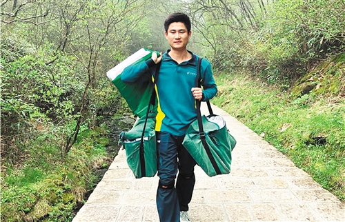 谢菲俊所在投递班的班长林鹏举告诉记者,黄山风景区内山路崎岖,无法行车,每天都要人力背负重物翻山越岭。谢菲俊一干就是3年多。