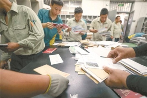 5月31日上午8时,北新桥投递部的邮递员在处理完包裹后又开始分拣信件。