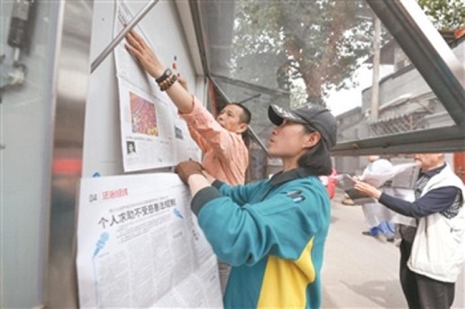 5月8日,刘小梅帮助社区志愿者在第一时间更换阅报栏的报纸。