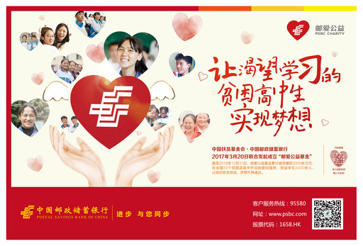 邮储银行于2017年3月20日成立十周年之际联合中国扶贫基金会成立“邮爱公益基金”,共同发起“邮爱自强班”项目,为贫困高中生提供教育资金资助及成才支持,并整合内外部、线上线下资源打造“邮爱公益平台”,号召全国近4万个网点参与到公益活动中来。