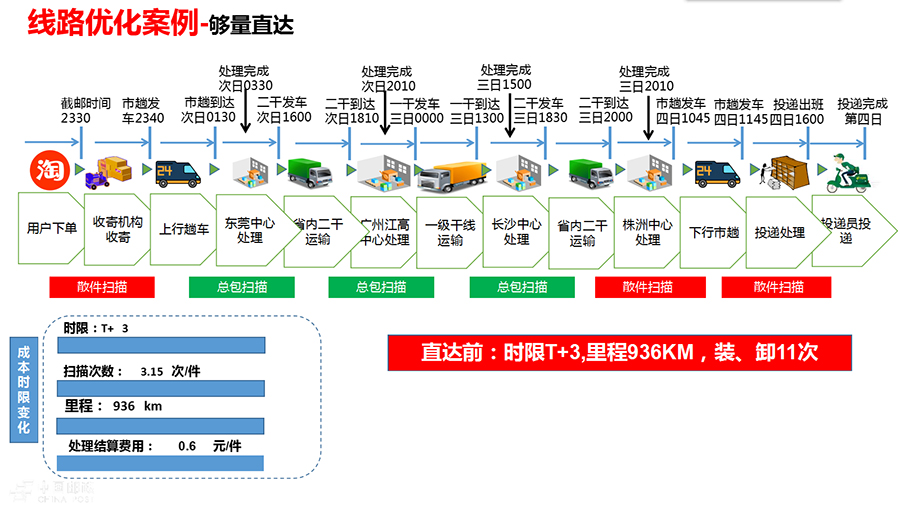 邮路要怎么捋?就是要以和竞争对手对标为任务,对每条线路从收寄到投递进行全环节梳理、全链路优化。以广东东莞—湖南株洲线路为例:这条线路目前日均包件量1000件,在全散件模式下,由于没有直达邮路,邮件从收寄到投递,每个邮件全程需经过6次散件分拣,11次散件装卸搬运,时限T+3。通过全环节捋、全流程捋、各环节优化,改为在东莞实施前置集包,散件在收寄网点直接分拣封入株洲总包,同时开通东莞—株洲直达邮路,邮件由原来在东莞—广州—长沙—株洲间散件装卸,优化为东莞—株洲总包装卸。通过这两种优化措施的结合,邮件由散件分拣6次、装卸搬运11次,将变为散件分拣3次、总包分拨3次、装卸搬运7次,减少了广州和长沙的4次总包装卸作业,处理结算费用降低39%,装卸效率大幅提升;时限水平由T+3将减少为T+1,达到次日递,超过主要竞争对手;全程运输里程从936公里将缩短为720公里,减少了23%,节约了运输成本。此外,在该线路日均邮件量较少的情况下,可以采取组开深圳—东莞—株洲串行直达的运输方式,在提高车辆装载率的同时,实现当天收寄的东莞—株洲邮件和18点前收寄的深圳—株洲邮件全程时限T+1。