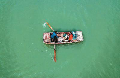 江苏省淮安市洪泽区老子山镇邮递员唐真亚划着小船和妻子闫玲前往新滩村送邮件。新华社记者 季春鹏摄