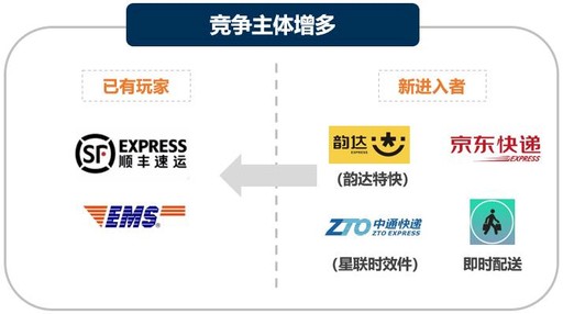 参与主体增多。京东开放个人寄件服务,通达系打造直营标快品牌,此外,即时配送强势冲击同城时效快递,既有竞争格局面临更多变数。(见图3)