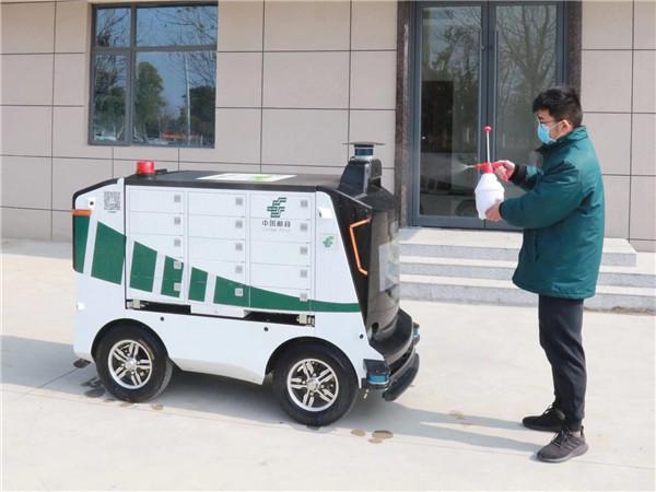 自正月初二起,无人投递车——“汉马”便开始忙碌运作起来,“汉马”投递车承担起了仙桃市政府及直属单位区域内的投递任务。每天清晨,投递员昌沁便早早的将需要妥投的邮件、报刊进行清分,携带至“智能邮局”站点,接下来,他并没有立刻将邮件逐一放入投递车格口,而是先拿出清洁酒精为“汉马”来一次全身消毒,这是他近几天以来,每天都要做的工作,早晚各一次,“这样能够彻底杜绝病毒的传播,让客户放心使用无人车取邮件,也让我们自己感到更加安心。”昌沁说。