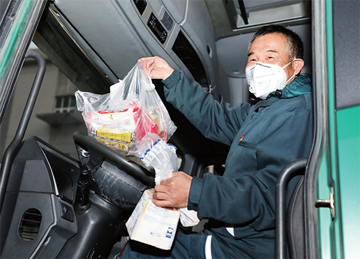 上海邮区中心局党员驾驶员程勋江展示单位给他们准备的食品,他全程要依靠这些“能量”将防疫援助物资运达武汉。□许雨舟 摄影报道