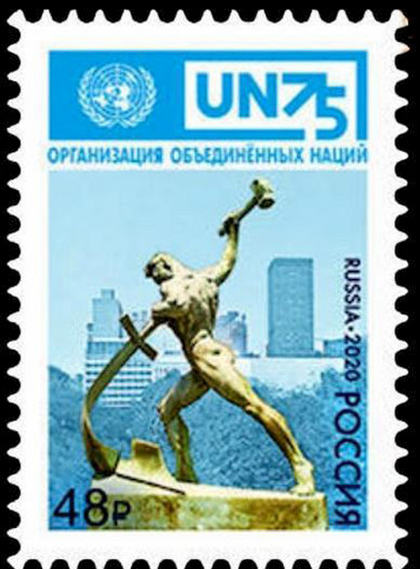 5月22日,俄罗斯邮政发行1枚邮票纪念联合国成立75周年。邮票图案为雕塑《铸剑为犁》,这是苏联于1957年送给联合国的礼物,并于1958年布鲁塞尔国际博览会上荣获大奖,是著名雕塑大师乌切吉奇的名作之一,代表了世界各国人民千百年来渴望和平的美好愿望。6月4日,德国邮政发行1枚邮票,庆贺联合国建立75周年。