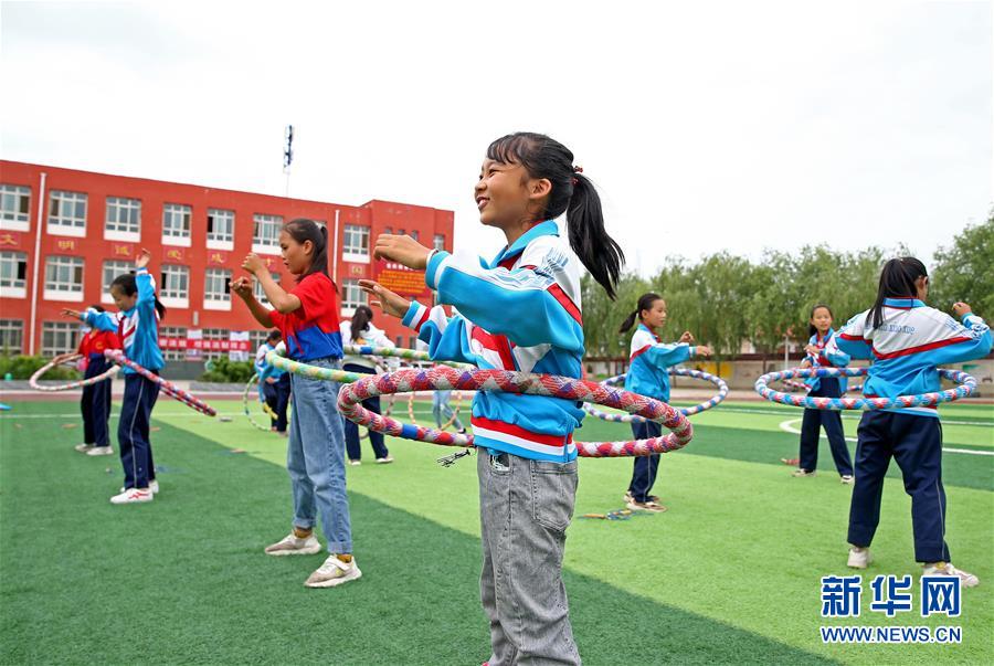 宁夏吴忠市红寺堡区红寺堡中心小学学生在体育课上练习呼啦圈(7月3日摄)。 新华社记者 贾浩成 摄