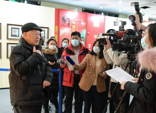 1月5日,《辛丑年》特种邮票设计者、艺术家姚钟华在展厅接受媒体记者的采访。新华社记者 李贺 摄