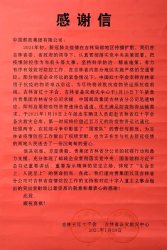日前,吉林省红十字会致信中国邮政集团有限公司,感谢吉林邮政迅速启用抗疫物资运输绿色通道,第一时间将吉林省红十字会价值近百万元的抗疫物资运达通化、松原两市,对中国邮政集团有限公司和吉林省分公司在吉林省疫情防控工作中给予的支持和为红十字人道主义事业作出的突出贡献致以崇高的敬意和衷心的感谢。