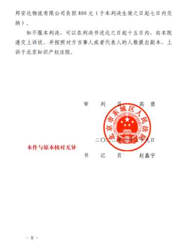 ”“中国邮政”商标构成近似,且涉案商标使用在物流运输服务上,对于公众而言容易导致对服务来源的误认或认为经营者之间具有许可使用、关联企业等特定关系,遂判令被告立即停止侵权行为、在《北京日报》上公开赔礼道歉并赔偿中国邮政1万元合理开支。