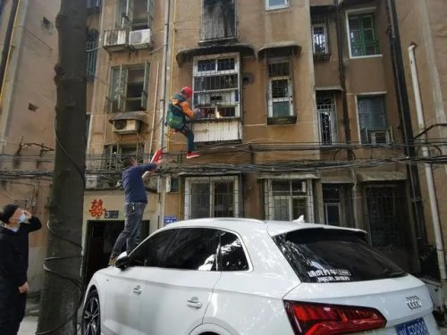 危急之下,虢术高捡了块石头,顺着楼房的外墙,借用防盗窗和燃气管道,麻利地爬上2楼窗口,用石头敲碎了玻璃,社区副书记蔡超给虢术高递上一个灭火器,虢术高接过后将喷射口通过窗口对准着火点,不到一分钟明火就被熄灭。