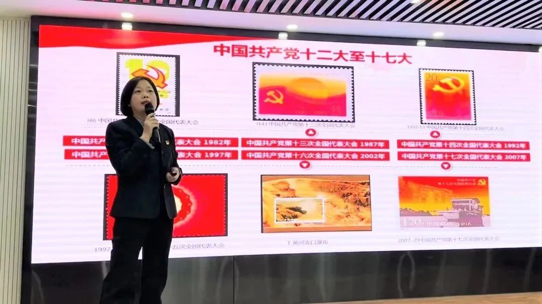 我们现在看到的这枚邮票是小型张,是为庆祝党的二十大胜利召开而发行的。该邮票以党徽、红旗、人民大会堂和欢庆的各族人民群众为画面主体,呈现了全国各族人民团结在一起共襄盛举。今天,我们就通过邮票来开启党的二十大精神学习……”3月7日下午,来自北京邮政教育培训中心的杨颜红老师在台上动情演讲,台下观众认真聆听。