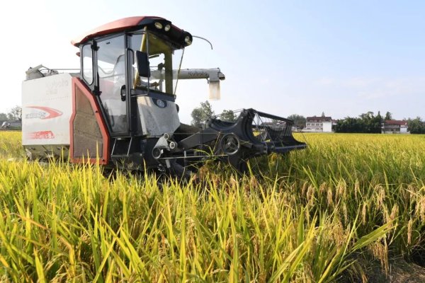大型联合收割机在稻田里收割