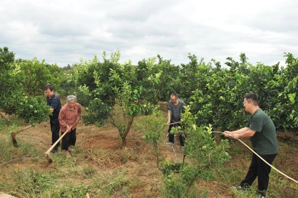 采访组在邮政惠农合作示范园为橙子树松土、浇水