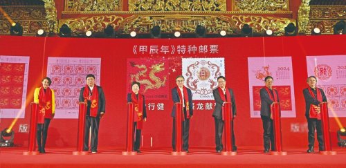 中国邮政携手港、澳两地邮政部门首次共同印制的生肖同题材邮票三地小全张于同日发行。中国邮政集团有限公司党组副书记、总经理郑国雨和香港邮政署署理副署长陈向黎、澳门邮电局副局长叶颂华、《甲辰年》特种邮票及三地小全张设计者王虎鸣共同为《甲辰年》邮票三地小全张发行揭幕。中国邮政集团有限公司副总经理温少祺、中国工艺美术馆(中国非物质文化遗产馆)副馆长魏大威为邮储银行生肖卡、邮政特快专递封套揭幕。