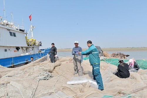 无棣埕口邮政支局投递员王海进在投递途中帮客户倒网收虾。