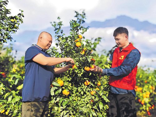 “中国沃柑看武鸣。”春节前正是广西壮族自治区南宁市武鸣沃柑上市的时节,南宁市邮政分公司以“党旗红 南邮旺”党建品牌建设为抓手,组织以青年党员为主的产业帮扶工作组,深入沃柑种植基地协助果农开展采摘、打包、收寄工作,并借助直播推动鲜果网销四方,推动党建工作与服务乡村振兴、打造沃柑产业协同互促。图为南宁市分公司产业帮扶工作组成员与果农一起采摘沃柑。 □谢向炫 卓晓 摄影报道
