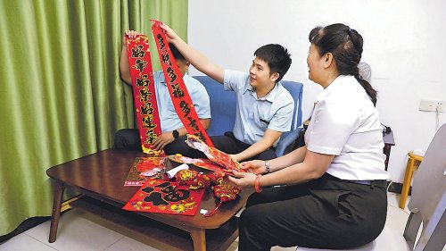 春节来临之际,海南省三沙市邮政分公司党支部宣传委员、工会小组长来到三沙市永兴岛,看望坚守在岗的一线员工,并为支局送去了春联、福字、日用品等,把“职工小家”装点出浓浓的年味。□本报记者 黄文燕 摄影报道