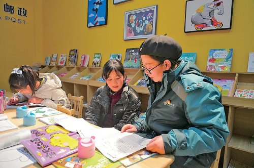 在“爱心书屋”,邮政工作人员陪伴孩子们度过充实、温馨的寒假时光。 □冉七龙 摄