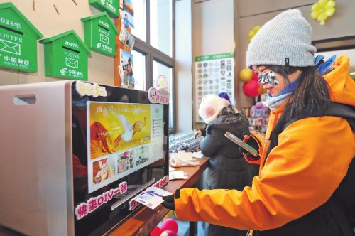 前来滑雪的游客在雪都邮局现场体验打印个人专属有声明信片服务。□滕俊 摄