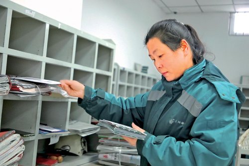 “先装远的,再装近的。”8点,她按照投递顺序把当天的报刊、信件和包裹从远到近装好后,对着镜子简单整理了一下装束,便从揽投部出发,沿着两相路向西,穿梭在投递服务区域的大街小巷。