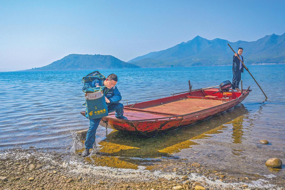 绿色摩托车、绿色邮包、绛红色渡船、碧波荡漾的水面和远处如黛的群山,石新国穿行其间,如同置身一幅青山绿水的秀美画卷。“这条邮路我已经走了20多年,只要乡亲们需要,我会一直走下去。”石新国坚定地说。