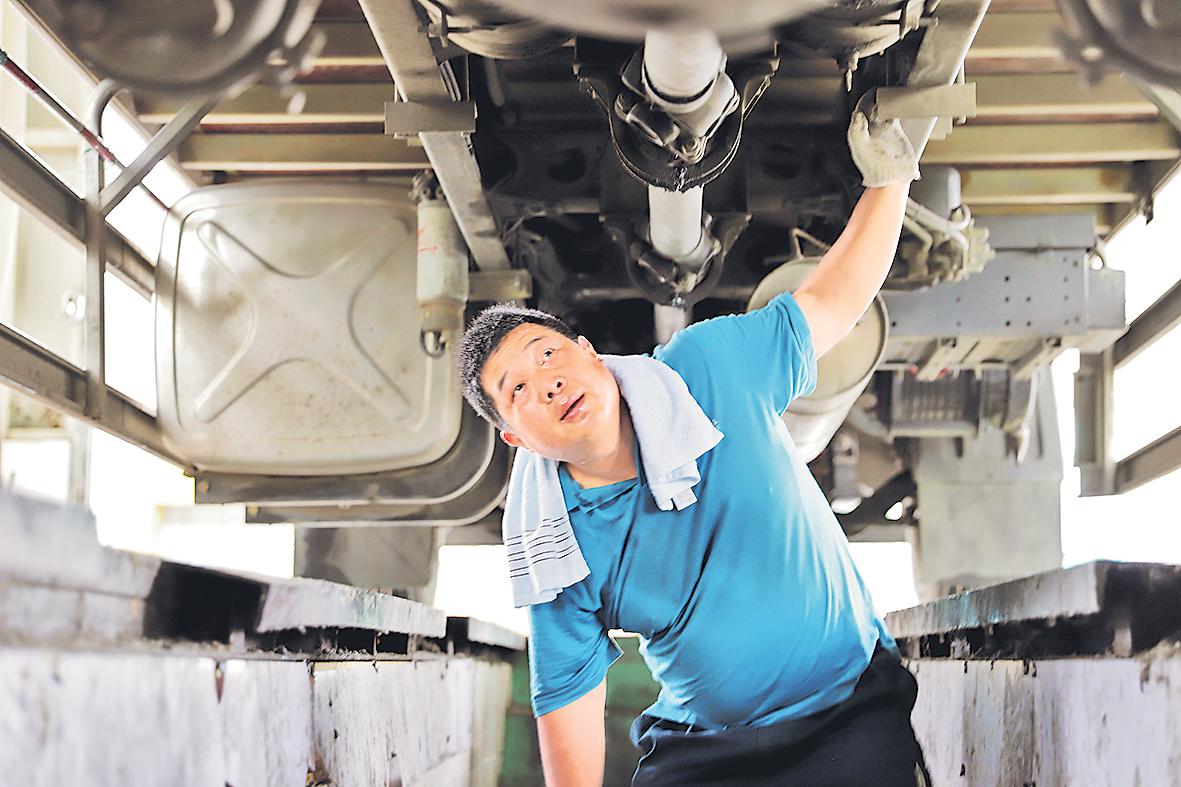 张旻归班后检修车辆。□周清 摄