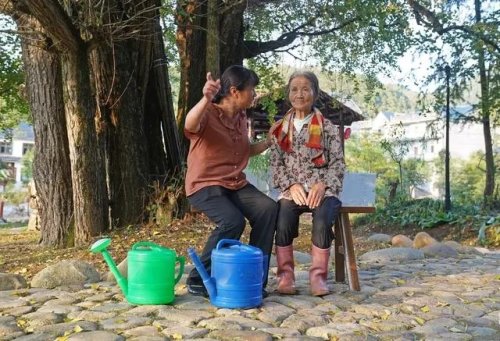 这是在江西省铅山县陈坊乡沽溪村,罗细英(左)与一位相识的老人聊天(9月28日摄)。新华社记者 万象 摄