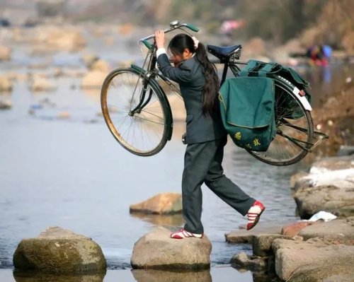 2007年1月,邮递员罗细英从陈坊乡出发前往锁子桥村(自然村)送信件和报刊,为了赶时间、抄近路,就扛着自行车过河。跟随采访的新华社记者在河边拍下了这张照片。如今,老照片拍摄地的小河沟上已建起了公路桥。