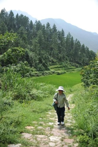 这是在江西省铅山县陈坊乡,罗细英在步行送邮件的路上(2011年7月20日摄)。新华社记者 周密 摄