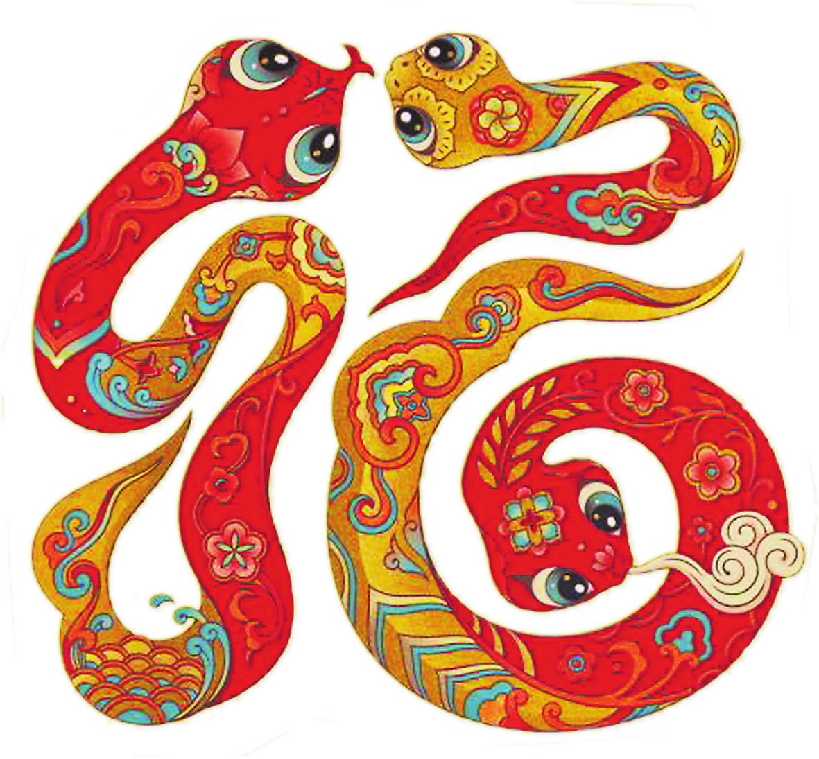 在生肖动物里,蛇的设计难度是比较大的。蛇的形象具有两面性,它有着吉祥的象征寓意,外形却又容易让人产生畏惧感。那么,如何让设计的蛇的形象能够被大众接受,是我这次创作面临的主要挑战。我希望塑造的蛇是对人亲近的,是活泼可爱、圆润丰满的,所以就通过灵动的线条和姿态来表现其造型,在画面上实现传统与现代审美之间的平衡。
