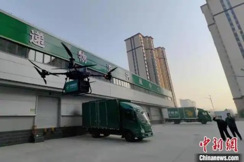 1月3日上午,一架无人机“邮递员”满载邮政快递,从河南省安阳市林州邮政寄递物流共配中心起飞,20分钟后降落在林州石板岩镇中心广场。这是安阳市首次开展山区无人机邮政快递航线测试飞行。