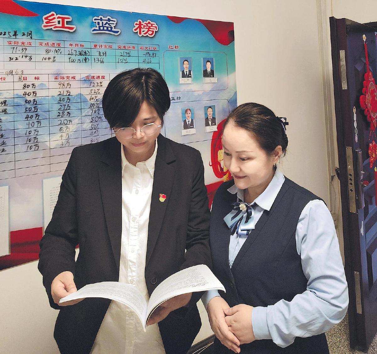 吴丽(左)在网点开展绩效面谈。