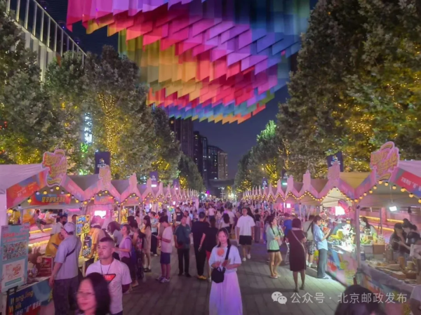 朝阳邮政升级了摊位视觉呈现,采用新款夜光板,使图案在夜幕下鲜艳夺目,远距离清晰传递摊位特色。同时,各摊位配备明信片卡折与白卡,直观展示特色纪念戳,有效引导人流。活动现场,工作人员积极推广可降解绿色包装,倡导“绿色寄递”理念,践行企业社会责任。
