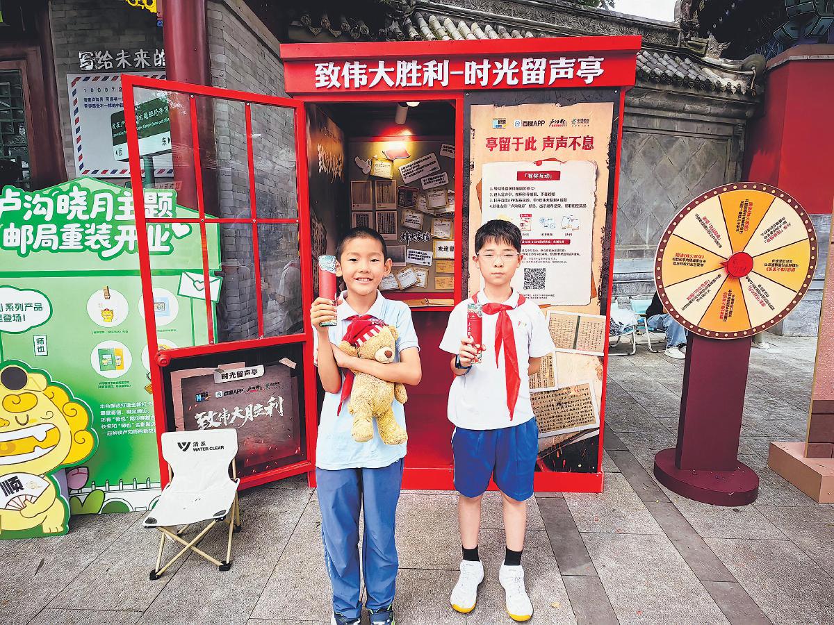 8月15日,“致敬伟大胜利”及烽火家信系列活动在北京市丰台区宛平城启动。该活动由百度App联合新华网、军事博物馆、退役军人事务部、北京市邮政分公司、卢沟桥文化公园等单位共同举办。游客在“致伟大胜利”时光留声亭旁,转动转盘即可选择录制内容,包括参观抗战展陈的体会、朗读一封感人的抗战家书或唱一首经典革命歌曲,产生的优质视频素材将由权威媒体整理后发布。参加“时光留声”录制的游客还可到旁边的卢沟晓月主题邮局领取抗战家书主题明信片,加盖专属纪念戳或购买其他文创产品。