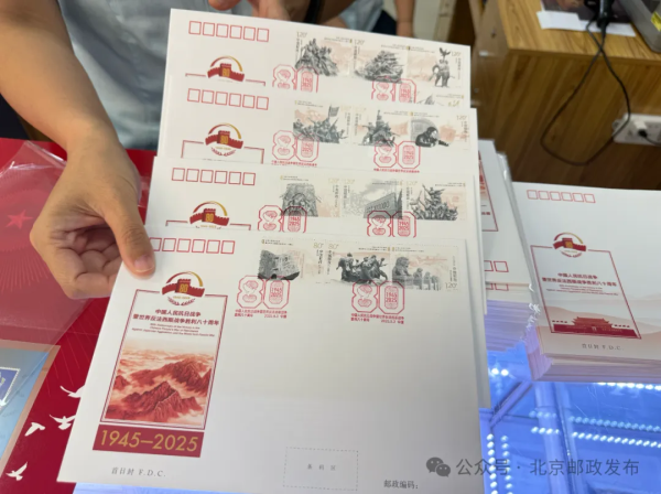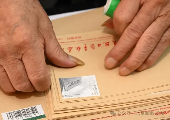 一位资深集邮爱好者正在将购买到的《中国人民抗日战争暨世界反法西斯战争胜利八十周年》纪念邮票贴在印制有“中国抗日战争纪念馆”字样的信封上。