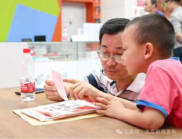 一位刚刚购买到《中国人民抗日战争暨世界反法西斯战争胜利八十周年》纪念邮票的集邮爱好者向自己的孩子讲述邮票背后的故事。