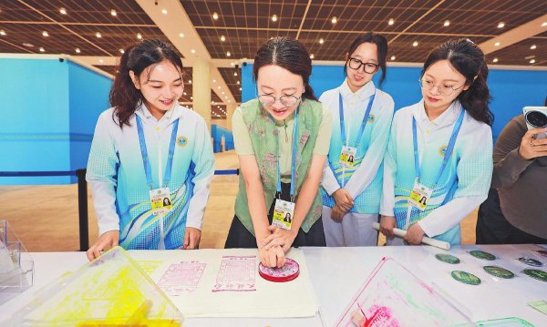 天津邮政充分发挥自身文化属性,聚焦“传统文化、大国外交、魅力天津”三大主题,结合天津城市特色,推出45款彰显天津文化和邮政文化的邮品。同时,天津邮政设置邮品互动体验区,展出中国首套邮票——大龙邮票。媒体记者和工作人员在欣赏邮票珍品的同时,还能体验大龙邮票拓印制作过程(见图),更加深刻感受到中国邮政的历史厚重感以及天津的文化底蕴。