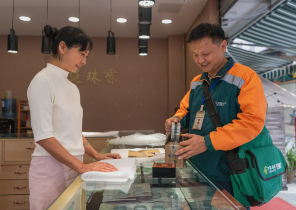 “小杨服务态度好,一打电话马上上门,包装产品比我们自己还要仔细。”商户潘正丽一边将客户精心挑选的翡翠手镯交给杨世谦,一边由衷称赞。对她这样的商户而言,邮政提供的不仅是寄递服务,更是一份沉甸甸的信任保障。杨世谦的脚步,不仅串起了商户与千里之外的市场,也让邮政的“靠谱”形象,成为这条财富之路上最令人安心的一抹绿色。