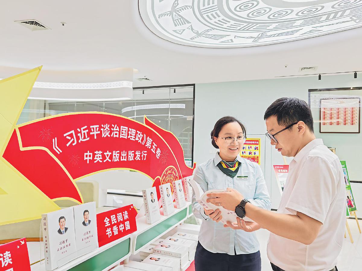 近日,走进广西壮族自治区南宁市金浦路邮政支局,一抹鲜艳的红色映入眼帘,红色背景的展板下,整齐排列着《习近平谈治国理政》第五卷图书。不少读者在此驻足,有的神情专注地翻看,有的在聆听工作人员介绍。市民张先生在选购图书的人群里格外显眼,他不仅自己购买,还打算帮家人和朋友代买。他表示,自己是一名党员,《习近平谈治国理政》第五卷图书对提升党性修养和理论素养大有裨益。“在邮政网点能够买到正版重点图书,十分方便,工作人员很贴心地向我介绍图书的信息。”张先生说。
