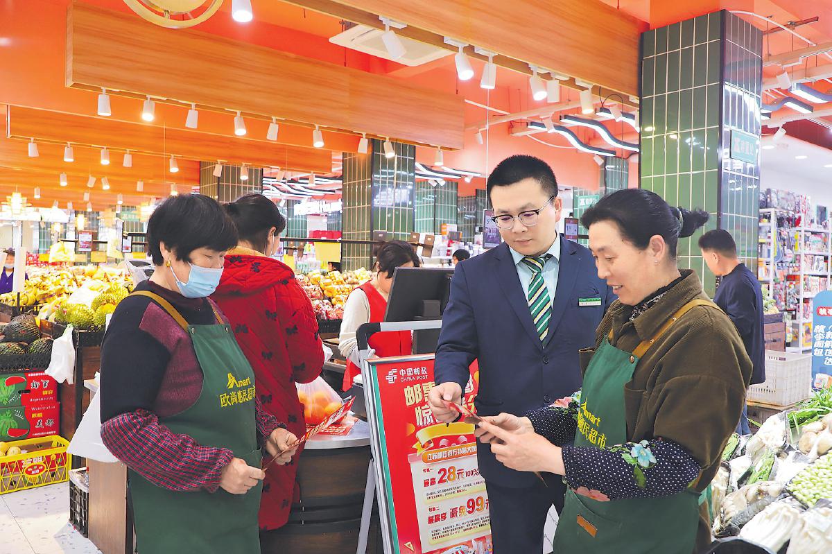 邮政工作人员在客流量大的超市现场提供产品咨询与投保服务。