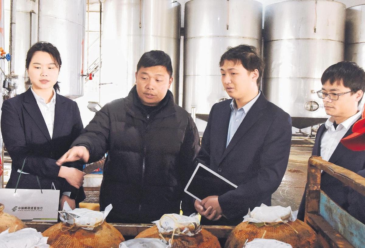 邮储银行南丰县支行工作人员走访酒厂客户。
