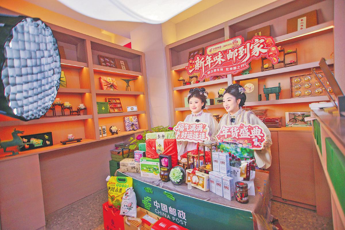 直播间不仅是“云游”窗口,更是助农惠民带货平台。依托邮政商流、物流、资金流、信息流“四流合一”优势,直播团队深入田间地头、非遗工坊,推介洛阳特色农品与文创产品。龙门主题邮局直播区,主播杨冰向网友介绍非遗青铜器:“这些器物全靠老祖宗传下来的失蜡法铸造,2011年这项手艺被列入河南非物质文化遗产名录。”在直播间里,伊川烟涧村仿古青铜器、孟津平乐村手绘牡丹扇、南北李记糕点等好物,她如数家珍。